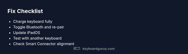 According to Keyboard Gurus, the most common causes behind why keyboard not working on ipad are connectivity problems, software glitches, or power issues. In practice, you can triage quickly by verifying power and connection, then moving to software checks. The aim is to identify whether the symptom appears across multiple apps or is isolated to a single program. If you find the issue is reproducible across apps, that strongly points to a system-level fault that needs a broader fix.