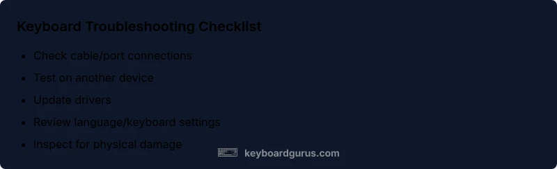 First, reseat the keyboard and test another USB port. Then update or reinstall drivers and check language/layout settings. If the issue persists, proceed with hardware checks.