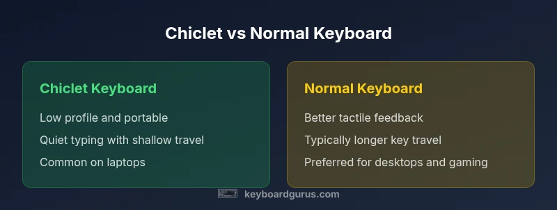 When people ask about chiclet keyboard vs normal keyboard, they’re weighing two widely used designs that shape how you interact with a device. Chiclet keyboards describe a low-profile layout where each key is a flat, square tile separated by visible gaps. Normal keyboards refer to the traditional island-style or desktop layouts with slightly raised keys, more pronounced keycaps, and greater travel. According to Keyboard Gurus, the choice between these styles affects typing comfort, mobility, and suitability for different tasks. For students who commute, portability and silence can outweigh travel depth; for writers and developers who spend long hours at a desk, tactile feedback and durability matter more. The distinctive look of chiclet keys worked their way into most modern laptops because they allow slim profiles and predictable key spacing. Meanwhile, standard island or mechanical-key variants on full-size keyboards emphasize travel, feedback, and longevity. Understanding these differences helps you map your needs to a keyboard type, rather than chasing a myth about one being universally better. In short, chiclet keyboard vs normal keyboard is less about a single winner and more about fit for your workflow, environment, and personal preference.