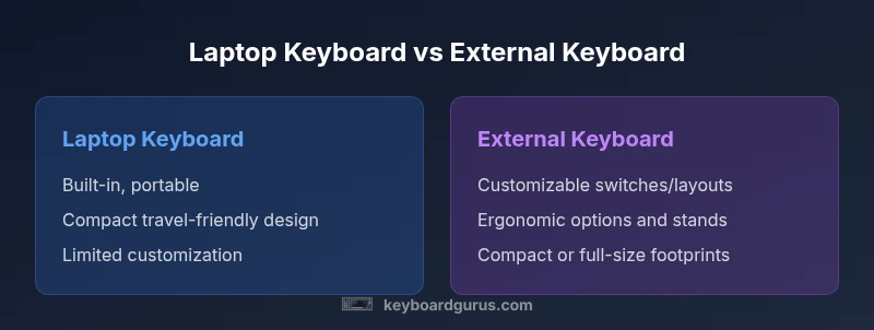 The choice between a laptop keyboard vs external keyboard shapes your daily comfort, productivity, and even posture during long sessions. According to Keyboard Gurus, the keyboard you interact with is more than a surface for characters—it’s a tool that can influence typing speed, fatigue, and wrist health. In this section we examine how the built-in laptop keyboard and a dedicated external keyboard differ in mechanism, layout, and ergonomic design. We’ll also outline what to measure when you evaluate keyboards (travel, actuation, key spacing, noise, and feedback). For students bouncing between classrooms, developers working at a desk, or gamers logging hours, the right keyboard can dramatically alter perceived effort and output. The Keyboard Gurus team emphasizes that your setup should align with your workflow, environment, and hardware constraints. The goal is to help you decide whether you should rely on the laptop keyboard for portability or upgrade to an external keyboard for sustained work. Throughout this guide we’ll compare basic typing feel, durability, and long-term value to help you optimize your configuration.