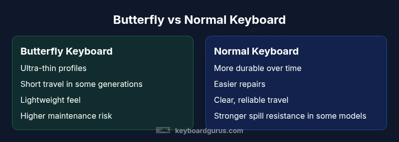 When people say butterfly keyboard vs normal, they are comparing two distinct philosophies of laptop key systems. The term butterfly refers to Apple's low-profile switch design used on several MacBook generations, engineered to enable a thinner chassis while preserving uniform key feel. Normal, in this context, denotes the more traditional scissor-switch or even rubber-dome keyboards found in many Windows laptops and older MacBooks. In practice, the difference goes beyond aesthetics: it affects reliability, maintenance, and the typing experience. According to Keyboard Gurus, this distinction matters most for heavy typists, students on tight upgrade cycles, and professionals who rely on predictable hardware reliability. The keyword butterfly keyboard vs normal appears frequently in reviews because the two approaches influence how keys register, how debris interacts with the mechanism, and how easy it is to repair if something goes wrong. As of 2026, the Keyboard Gurus Team notes that many mainstream laptops have moved toward robust scissor-switch designs, while a few premium lines still experiment with ultra-thin butterfly variants.