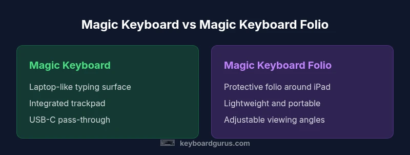 The two main Apple keyboard accessories for iPad are the Magic Keyboard and the Magic Keyboard Folio. Both extend the iPad's capabilities, but they target different user personas. According to Keyboard Gurus, the magic keyboard vs magic keyboard folio decision centers on whether you value an authentic laptop-like typing experience with a built-in pointing device, or a lighter, protective form factor that travels well. This comparison outlines core differences in form factor, input methods, and ecosystem integration, so you can map your daily tasks to a specific accessory.