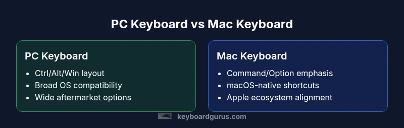 The choice between a PC keyboard and a Mac keyboard is more than swapping a few labeled keys; it's about aligning your typing surface with your operating system's workflow. In the pc keyboard vs mac keyboard decision, the core differences revolve around modifier keys, shortcut expectations, and how software interprets keystrokes across platforms. According to Keyboard Gurus, the most meaningful distinctions appear at the level of OS integration, where key mappings, accessibility features, and developer preferences shape everyday use. For Windows or Linux environments, a standard PC keyboard provides universal compatibility, a familiar set of shortcuts, and easier customization through firmware and macros. On macOS, a dedicated Mac keyboard (or a well-mapped USB keyboard) preserves Command-centric shortcuts, smoother system-wide consistency, and a feel that's tuned to Apple's design philosophy. The upshot is simple: if your daily tasks rely on platform-native shortcuts and applications, your keyboard choice should reinforce that workflow rather than strain it.
