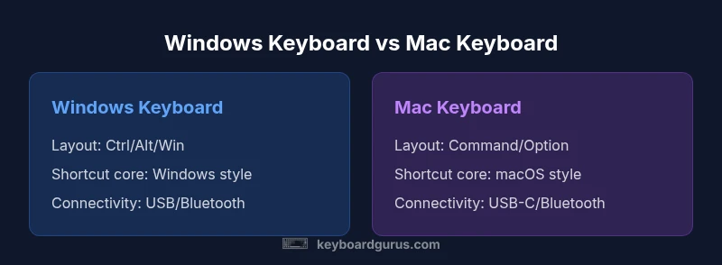 According to Keyboard Gurus, the difference between a Windows keyboard and a Mac keyboard goes far beyond the legends on the keys. The choice influences shortcut habits, app behavior, and even how you navigate system prompts. In this guide, we analyze the two ecosystems side by side and explain practical implications for students, gamers, professionals, and keyboard enthusiasts. By focusing on layout, shortcuts, and interoperability, you can optimize a single input device for cross OS workflows or choose a dedicated keyboard for each environment. The term windows keyboard vs mac keyboard captures a broad spectrum of hardware variants—from budget membrane boards to premium mechanical keyboards—so the aim is to clarify which characteristics matter most for your setup.