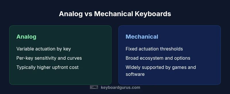 An analog keyboard represents a shift away from fixed actuation thresholds. Each key is equipped with sensors that translate how far you press, the force you apply, or even the speed of the press into a graded input. That means the same keypress can register differently based on how deeply you actuate the key, enabling a continuum of input levels rather than a binary “pressed/not pressed” signal. In this sense, the topic of analog keyboard vs mechanical becomes apples-to-oranges for some users, because you’re comparing a variable input model with fixed switch actuation. The practical upshot is nuance: tasks such as nuanced gaming maneuvers, drawing, or precise typing can benefit from fine-grained control. Keyboard Gurus Analysis, 2026 shows that adoption is strongest among enthusiasts who value per-key curves and customizable sensitivity, rather than casual typists who prioritize consistency and ease of use.