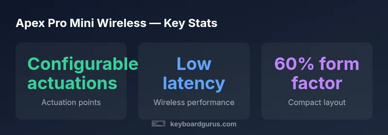 According to Keyboard Gurus, the Apex Pro Mini Wireless targets keyboard enthusiasts who crave a high-density, travel-friendly workstation without giving up the ability to tailor key behavior. Its core appeal lies in a compact footprint that frees desk space while delivering the familiar SteelSeries ecosystem and reliable wireless performance. The Keyboard Gurus team found that the 60% layout is particularly compelling for esports players and students who need a portable setup for on-campus tournaments or LAN sessions. The decision to focus on adjustable actuation, robust software, and a sturdy, compact chassis reflects a deliberate strategy to bridge portability with professional-grade customization. For readers who want a device that travels well but still behaves like a full-size board when docked, this model often resonates as a core option in modern mechanical keyboard roundups.