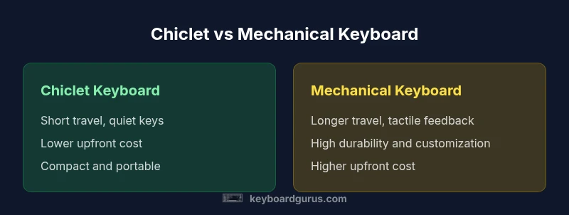 According to Keyboard Gurus, the chiclet keyboard design refers to flat, square-ish keys on a low-profile structure, typically found on laptops and thin external keyboards. Mechanical keyboards, by contrast, rely on individual switches beneath each key, offering tactile feedback and longer lifespan. This fundamental difference shapes every subsequent decision, from typing comfort to noise levels and upgradeability. For many users, the choice isn't about aesthetics but about how the keyboard will be used day-to-day: office work, coding, gaming, or casual browsing. In 2026, the market continues to split into compact chiclet models that emphasize portability and quiet operation, and feature-rich mechanical boards that cater to enthusiasts and professionals who value performance. We will compare the two along a practical framework—typing feel, durability, cost of ownership, noise, and upgrade potential—so you can choose confidently for your setup.