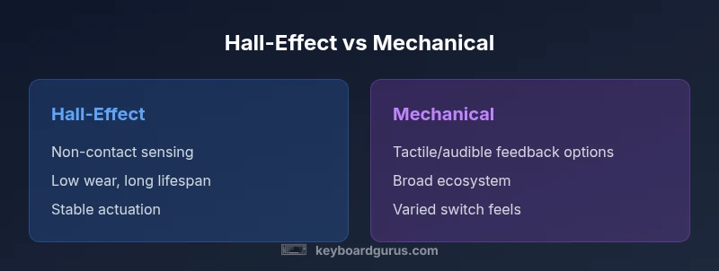 In the hall effect keyboard vs mechanical debate, hall-effect designs use non-contact magnetic sensing for your keystrokes, delivering exceptional durability and low maintenance. Mechanical keyboards, by contrast, emphasize tactile feel, broad switch options, and a thriving accessory ecosystem. Keyboard Gurus analysis suggests choosing based on whether longevity and consistency or tactile feedback and customization matter more to your workflow.
