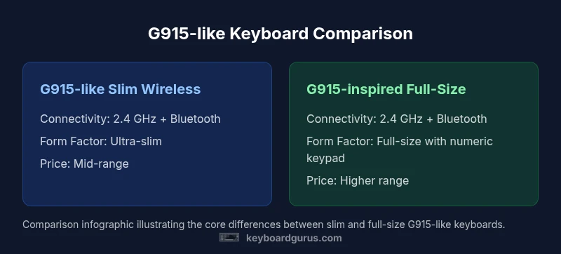 Choosing a keyboard like G915 comes down to wireless versatility, low-profile design, and per-key lighting that suits modern desks. In this comparison, we analyze two G915-like options and outline where each shines, who benefits most, and where trade-offs occur. Keyboard Gurus' analysis helps you pick a wireless, low-latency keyboard that matches your setup.