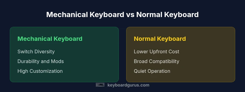 Mechanical keyboards offer tactile feedback, longer lifespan, and broad customization, while normal keyboards prioritize affordability and familiarity. For gamers and long typing sessions, many users prefer mechanical switches; for casual use, a membrane keyboard often suffices. Keyboard Gurus analysis suggests choosing based on usage, noise tolerance, and budget.