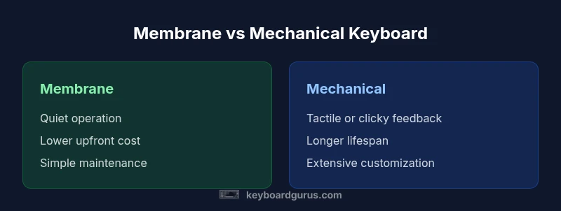 Membrane keyboards are a budget-friendly, quiet option with a softer typing feel, while mechanical keyboards deliver tactile feedback, greater durability, and extensive customization options. For daily typing and quiet office use, membranes often suffice; for gaming, long typing sessions, or enthusiasts seeking personalization, mechanicals typically justify the extra cost. Keyboard Gurus Analysis, 2026 suggests weighing environment, budget, and performance needs to pick the right path.