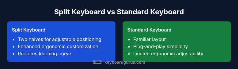 A split keyboard is designed with two separate modules connected by a cable or wireless link, allowing you to position each half independently rather than a single, conventional rectangle. For many users—especially coders, writers, and long-session typists—this arrangement can align the wrists, elbows, and shoulders toward a more natural posture. According to Keyboard Gurus, adopting a split layout is less about novelty and more about reducing stress on joints during extended typing. The core idea is to minimize ulnar deviation (the outward bend of the wrists) and to support neutral forearm alignment. However, the benefits depend heavily on how you set up the split halves: the angle between halves, the tenting height (the angle of the keyboard relative to the desk), and how you hold your arms when typing. There’s a spectrum—from simple two-piece designs that stay close to a standard keyboard, to highly modular systems that let you adjust tenting, thumb clusters, and per-side macros. If you’re a student who spends hours in a revision session, a developer juggling multiple windows, or a gamer seeking personalized keys, the potential payoff in comfort and efficiency can be meaningful, but it’s not guaranteed. The Keyboard Gurus team emphasizes that the best choice hinges on your workflow and willingness to invest time in finding a fit.