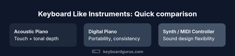 According to Keyboard Gurus, the term keyboard like instruments describes a broad family that includes acoustic pianos, digital pianos, synthesizers, MIDI controllers, and hybrid keyboards. For players who value touch, dynamic range, and musical expression, understanding this spectrum helps align technique with instrument capabilities. Keyboard Gurus analysis shows that enthusiasts who master the core differences between these categories make faster progress and avoid costly missteps. In practice, keyboard like instruments function as both creative tools and robust learning platforms across genres such as classical, jazz, electronic, and pop. This article provides an evidence-based framework to compare action, tonal generation, ecosystem, and value. As you read, note how space, budget, and playing goals shape which branch of the family is most appropriate.
