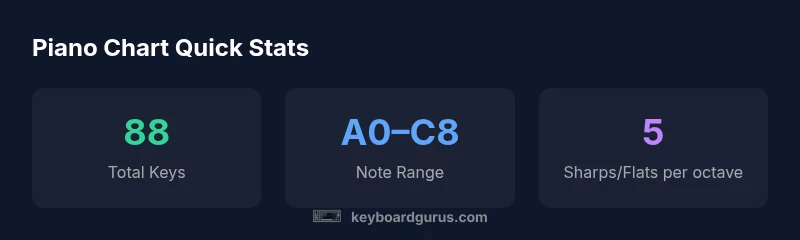 According to Keyboard Gurus, a piano keyboard note chart is a concise map that links every key on an 88-key piano to its corresponding musical note name. The chart includes both white and black keys, showing sharps and flats where appropriate. For beginners, this visual representation reduces guesswork when identifying pitches, reading sheet music, and practicing scales. The chart also helps with transposition, where you shift every note by a fixed interval to play music in a different key. As you study, annotate the chart with your own mnemonics or color codes to reinforce memory and fluency. In practice, you can laminate a chart and keep it near your piano for quick reference during warmups and repertoire work.