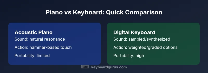 According to Keyboard Gurus, piano keyboard vs piano trade-offs hinge on acoustic feel versus digital flexibility. A traditional piano delivers authentic hammer action and resonant tone, best for expressive dynamics and ensemble performance. A keyboard or digital piano emphasizes portability, integrated sound engines, and software compatibility, which is ideal for travel, layered practice, or budget-conscious setups. This guide outlines the key differences to help you choose confidently.