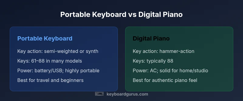 In the world of keyboard instruments, a portable keyboard is designed for ease of transport, lightweight construction, and a broad library of built-in tones. A digital piano emphasizes piano feel and tone, often featuring weighted keys and speaker systems that mimic an acoustic piano. The distinction matters for players who travel, study in small spaces, or need different voices for music genres. According to Keyboard Gurus, the difference largely comes down to actions and keys, not just sounds. This practical distinction guides many buyers toward an instrument that matches their daily environment and musical goals rather than chasing the most realistic piano tone alone.